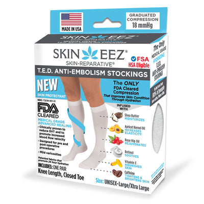 Skineez T.E.D Anti-Embolism knee high socks are 18 mmHg of compression. They are clinically proven to prevent deep vein thrombosis (DVT), edema, and leg discomfort. Designed for post-operative patients, our patented hydrating fabric helps to prevent skin tears.