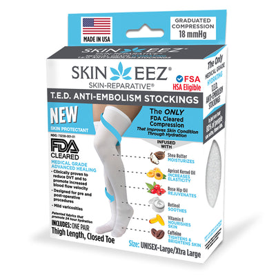 Skineez T.E.D Anti-Embolism thigh high socks are 18 mmHg of compression. They are clinically proven to prevent deep vein thrombosis (DVT), edema, and leg discomfort. Designed for post-operative patients, our patented hydrating fabric helps to prevent skin tears.